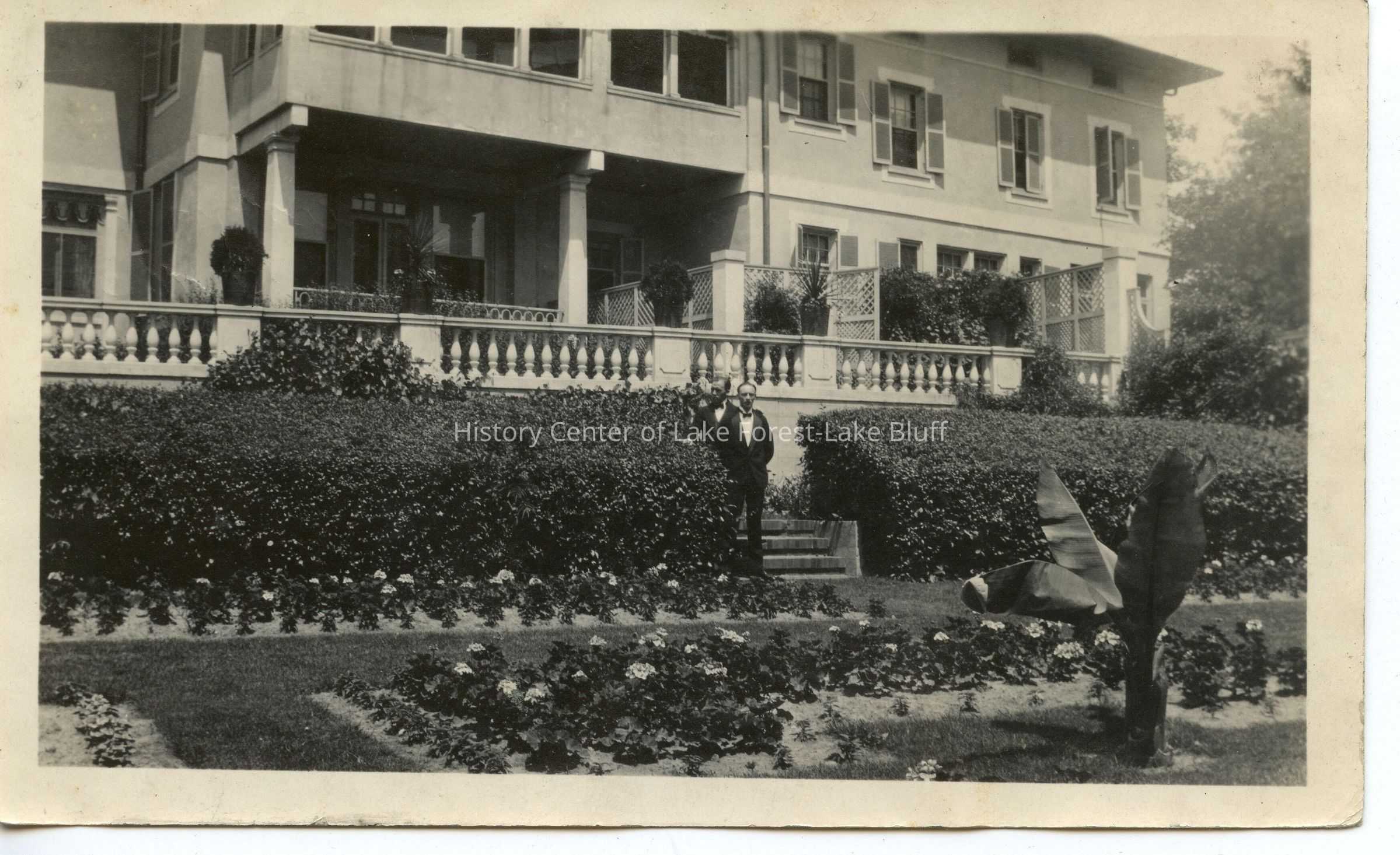 Rear of house at J.R. Thompson estate, West Highlands, 1500 North Green Bay Road or1313 North Green Bay Road. Two unidentifed men in tuxedos. Formal garden.