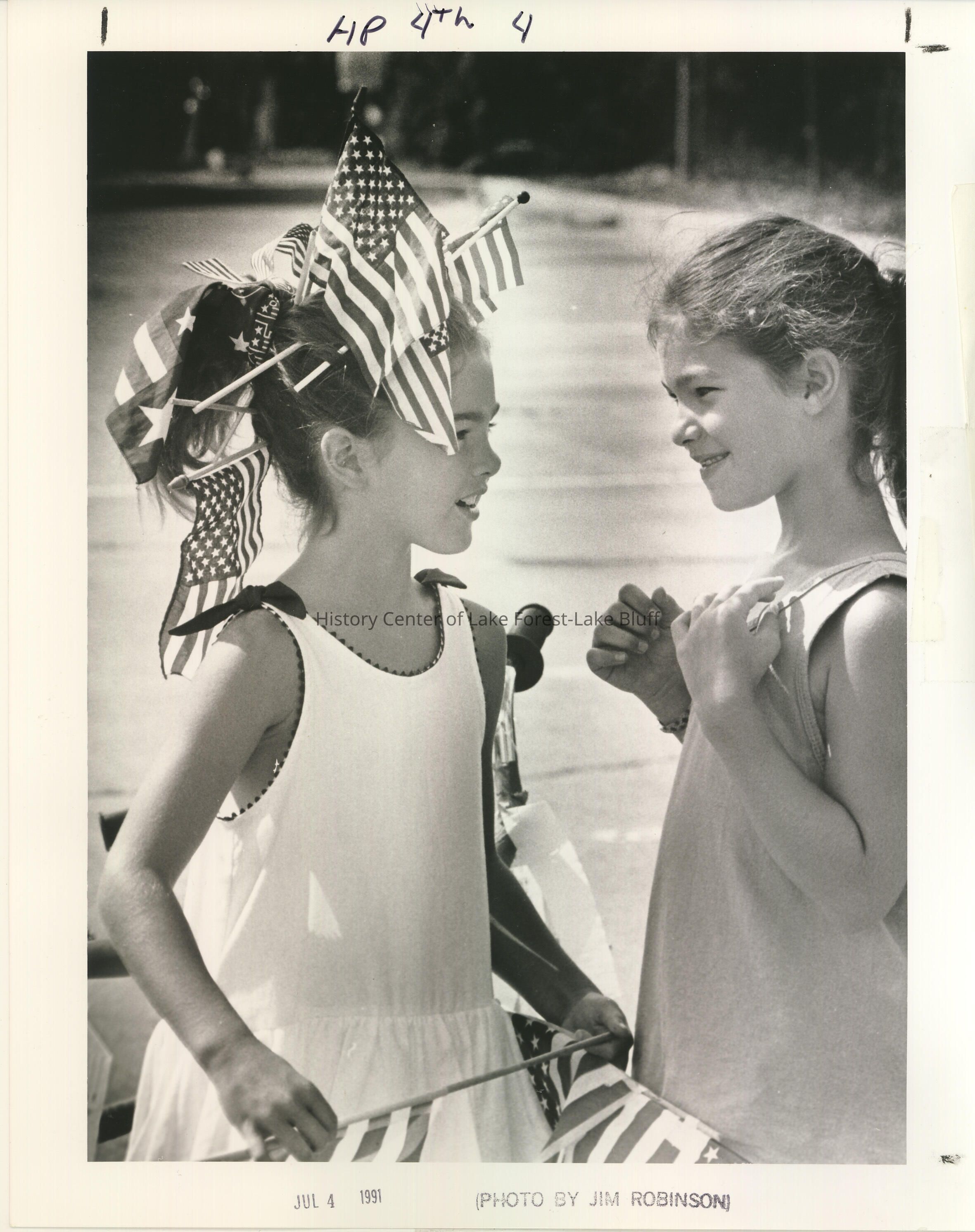 Two young girls talk, one with a multitude of American flags stuck into her ponytail. July 4, 1991.