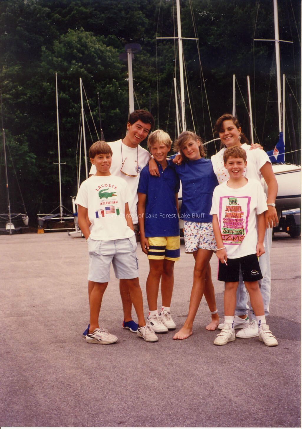 Group shot of six, young sailors, 3 boys and 1 girl; 2 young adults, one male and one female possibly counselors at Forest Park beach.