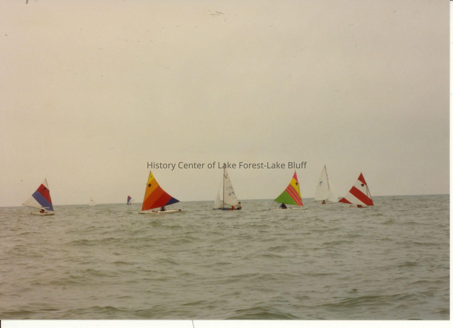 Several sailboats in the distance, overcast sky; sails are red and white, green and yellow, orange, yellow and blue in Lake Michigan off Forest Park beach.