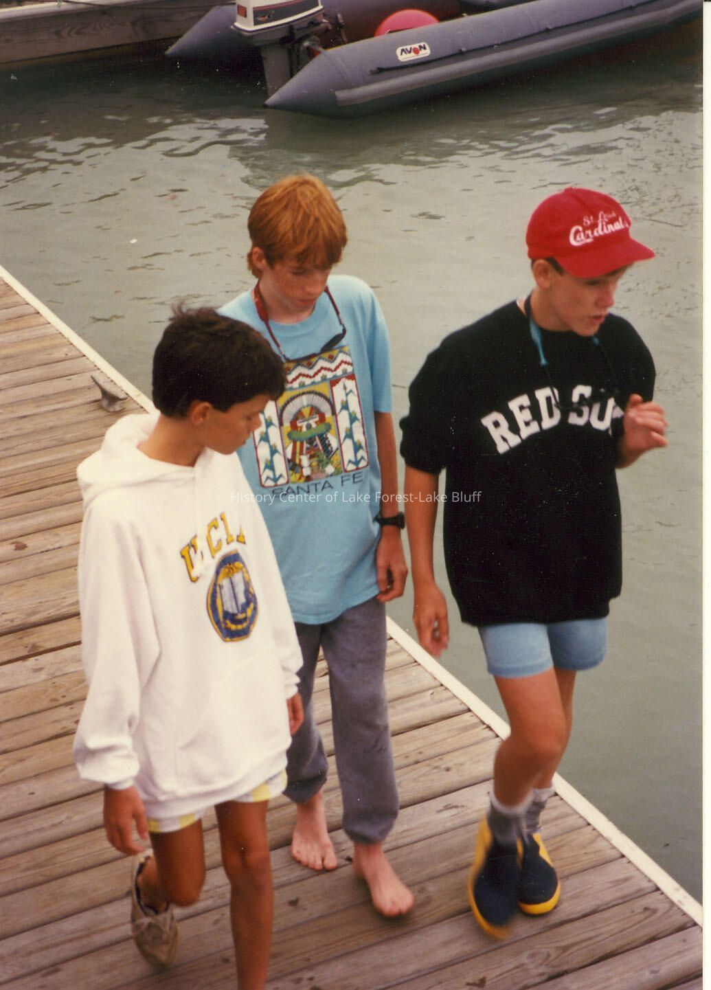 Three young sailors walking along the pier.Wearing sweatshirts that say Red Sox, Santa Fe and UCLA, one is wearing a Cardinals baseball cap at Forest Park beach.