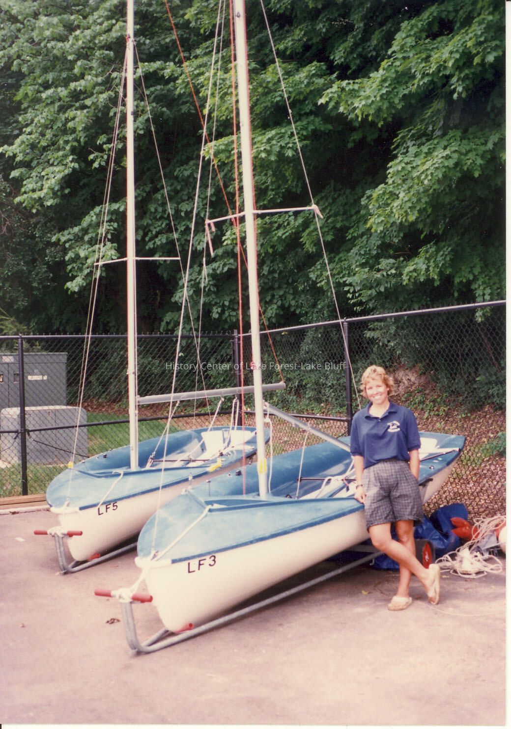 Female sailor posing by two sailboats on shore at Forest Park beach.