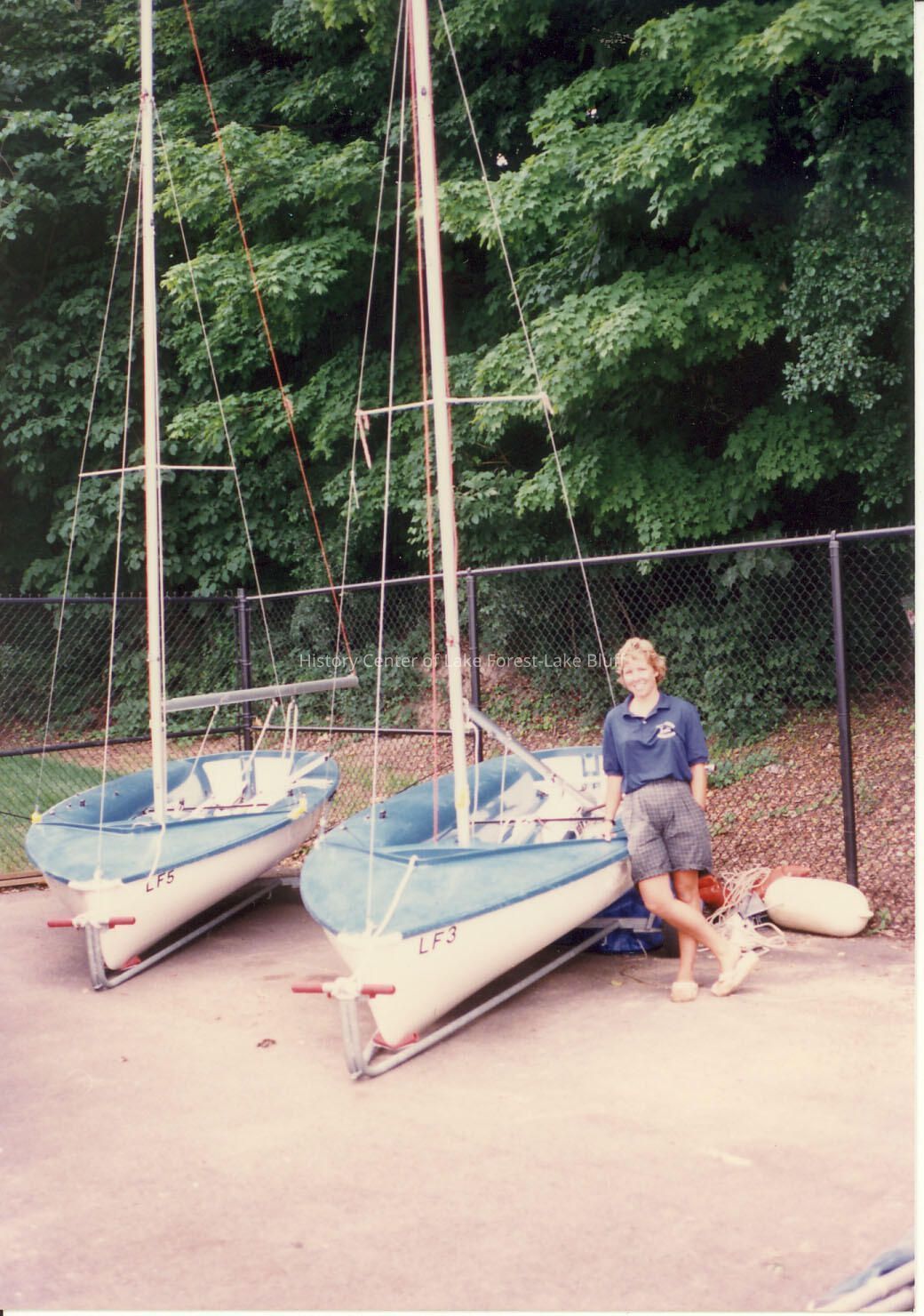 young woman with blue shirt standing near two sailboats at Forest Park beach.