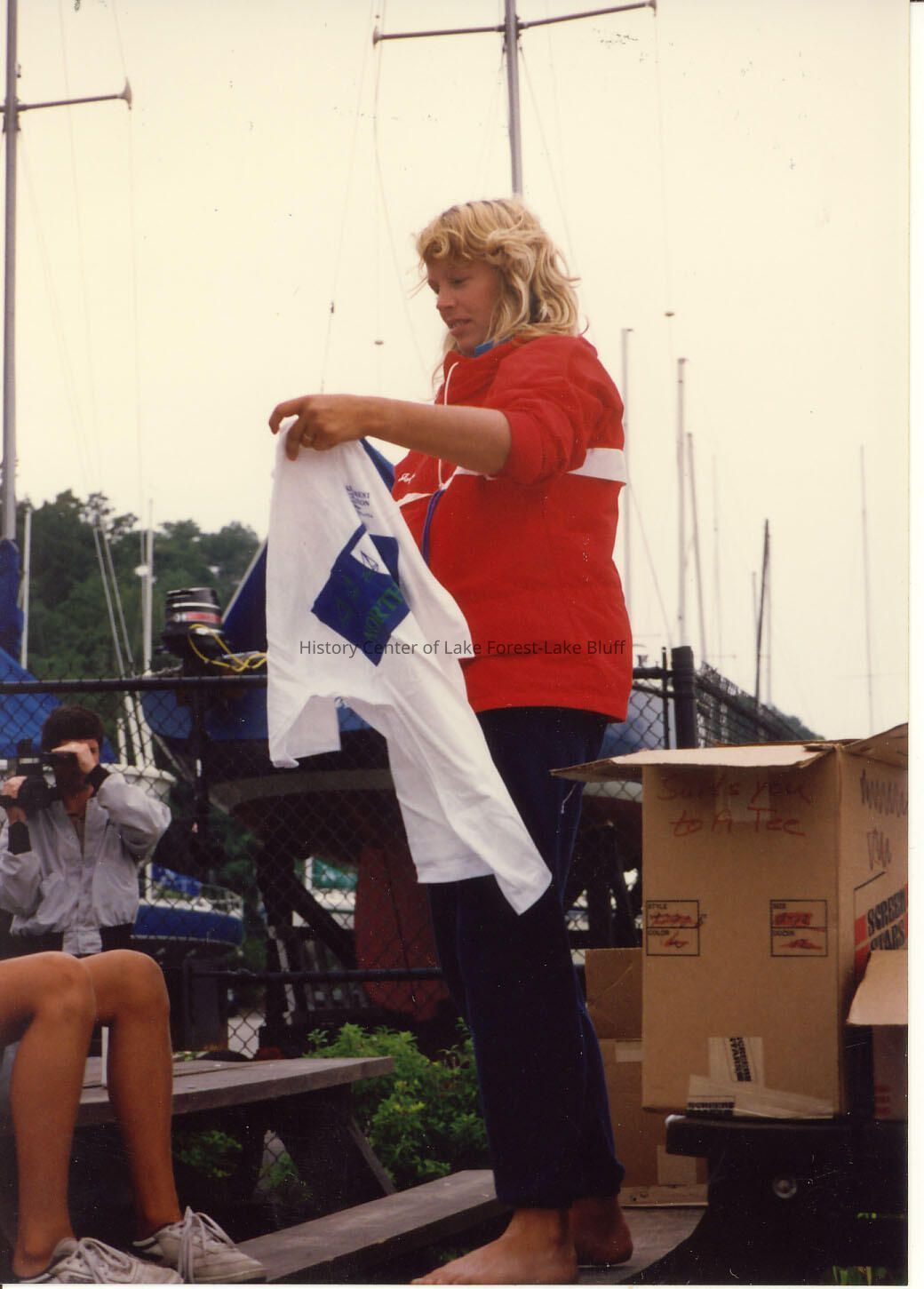 Woman in red sweatshirt holding up a t-shirt, that maybe is a prize at Forest Park beach.