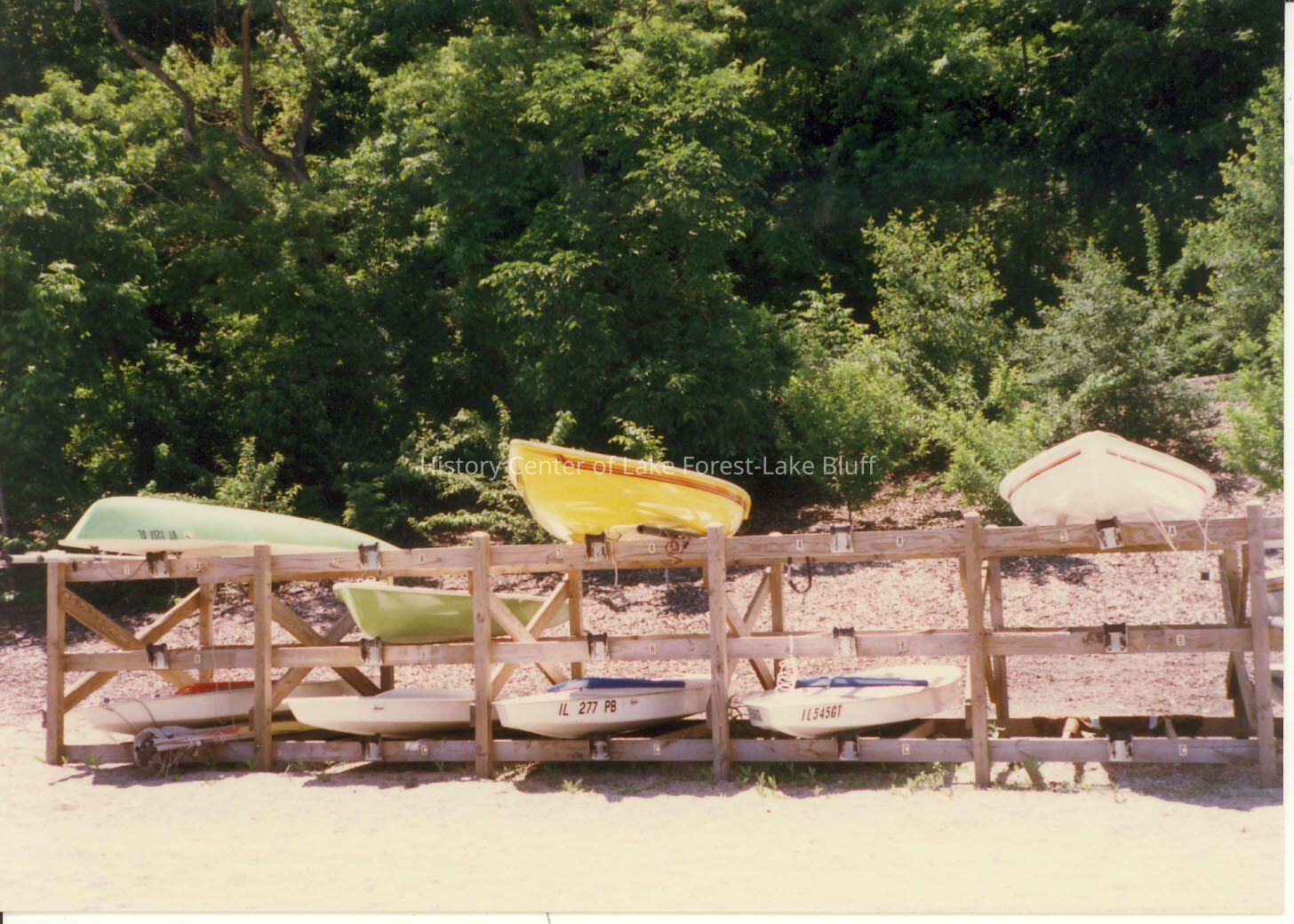 Small sailboats on slips, yellow, blue and white at Forest Park beach.