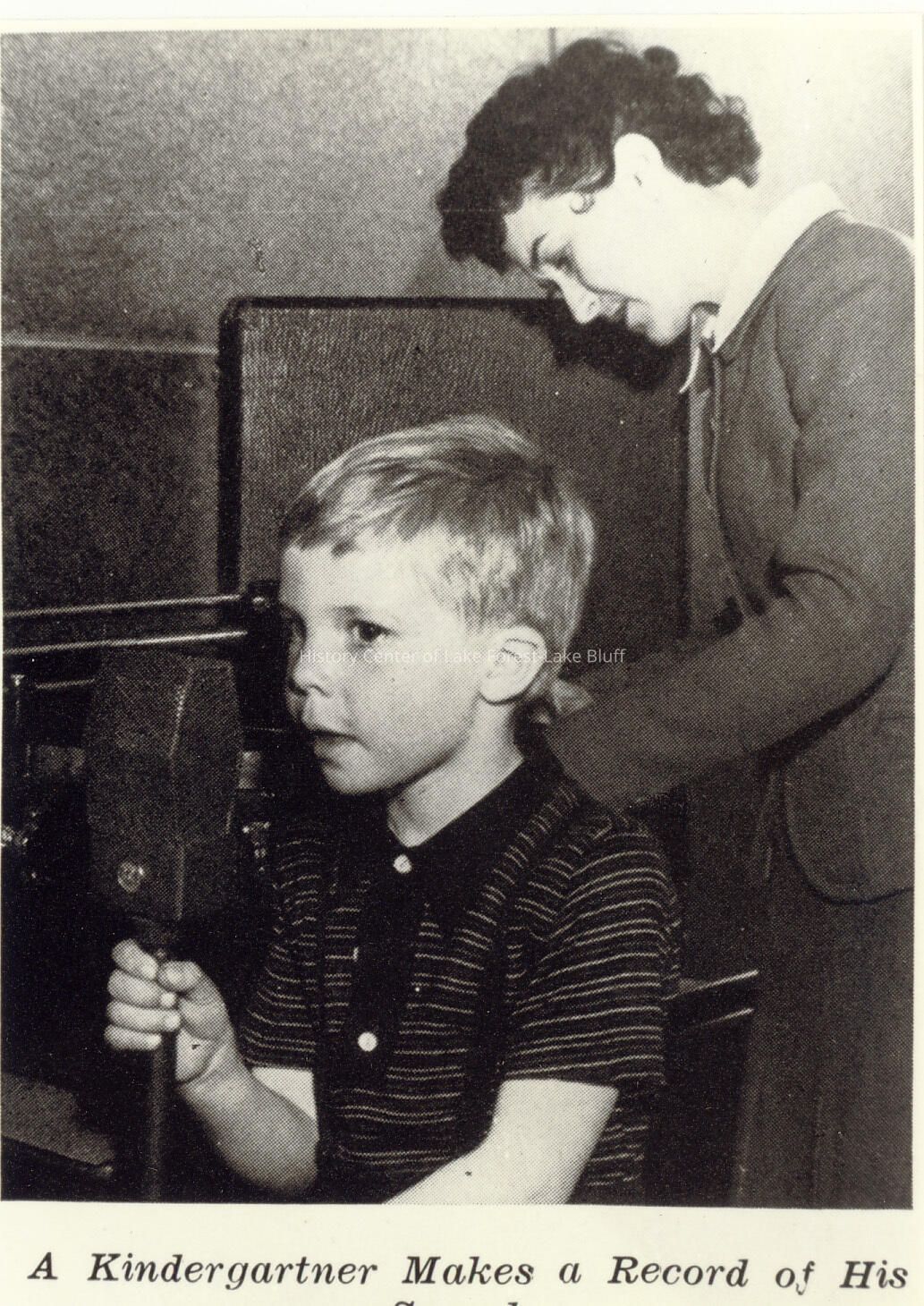 A kindergarten student with a microphone. Miss Bobbie Bowers, teacher in background