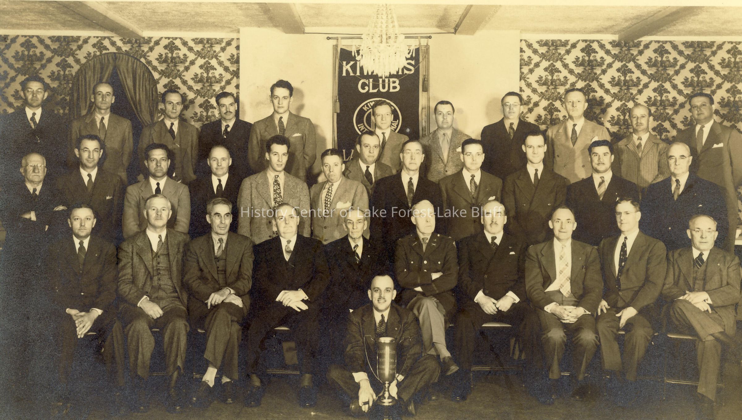 Lake Forest Kiwanis Club. Men in suits seated in three rows for picture