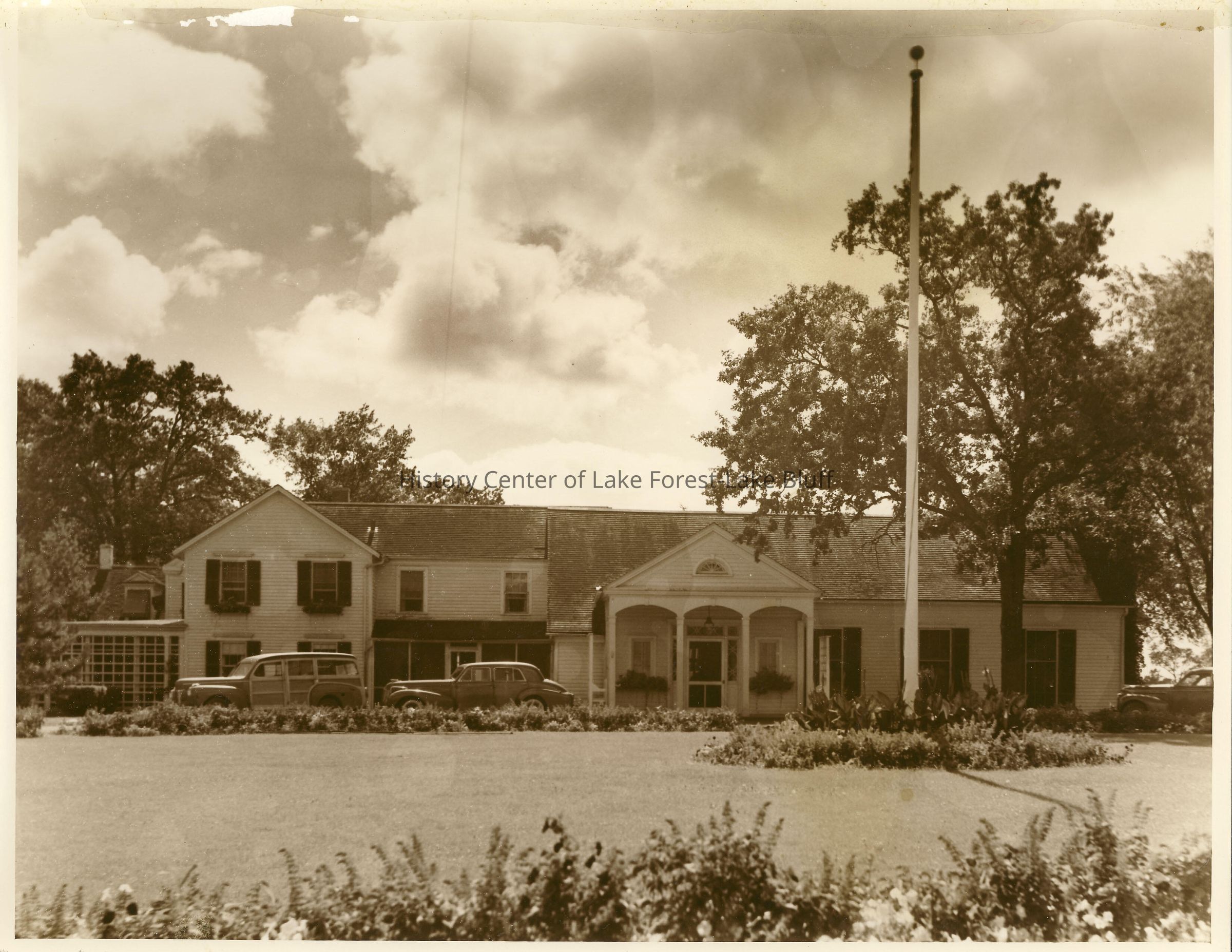 The photograph is the Knollwood Club clubhouse, 1890 Knollwood Road, Lake Forest. This picture is of the same building from 2005.65.4 but at a different angle. In this picture you can see a circular drive way filled with cars and a flag pole.
