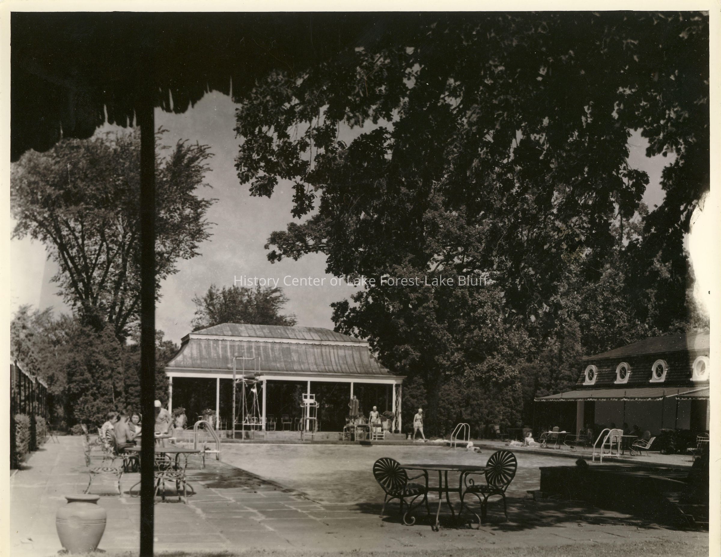 The photograph is the Knollwood Club, 1890 Knollwood Road, Lake Forest. The photo is of the pool and its surrounding buildings. The pool has a diving board, lawn tables set up around it. Two visible buildings near the pool. On the back, the photo was by Ward McMasters and a stamp on the bottom also says Edward Arpee of 383 Washington Road LF.