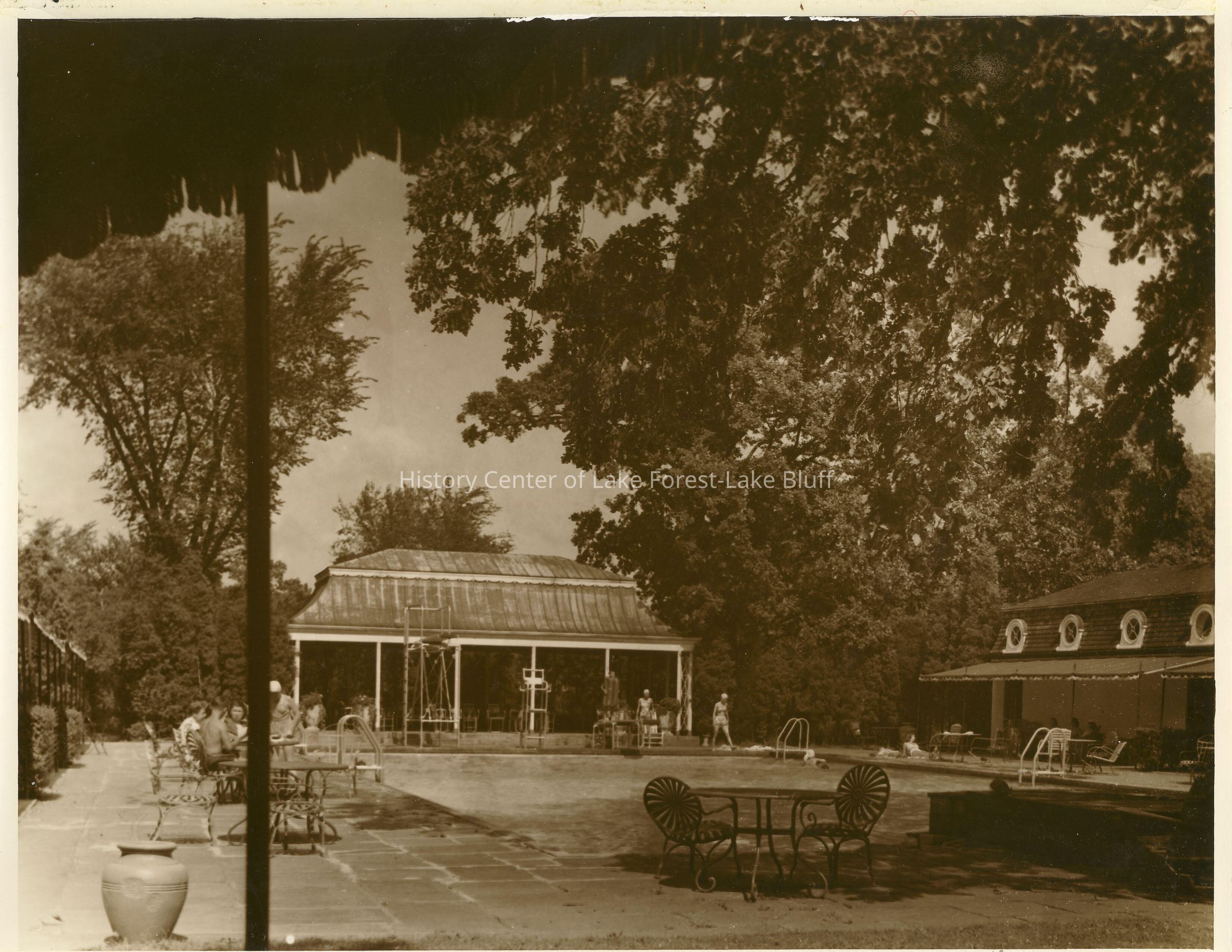 The photograph is the Knollwood Club, 1890 Knollwood Road, Lake Forest. The photo is of the pool and its surrounding buildings. The pool has a diving board, lawn tables set up around it. Two visible buildings near the pool. On the back, the photo was by Ward McMasters and a stamp on the bottom also says Edward Arpee of 383 Washington Road LF.