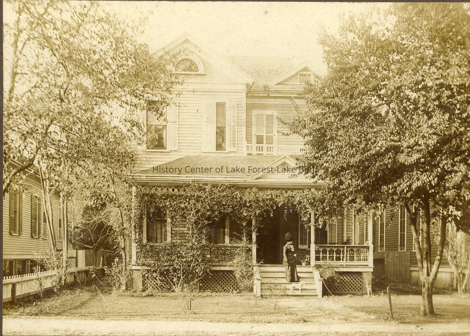Black and white photo of a house in Lake Bluff witha woman and a dog on the front steps Harvey family of Lake Bluff ?