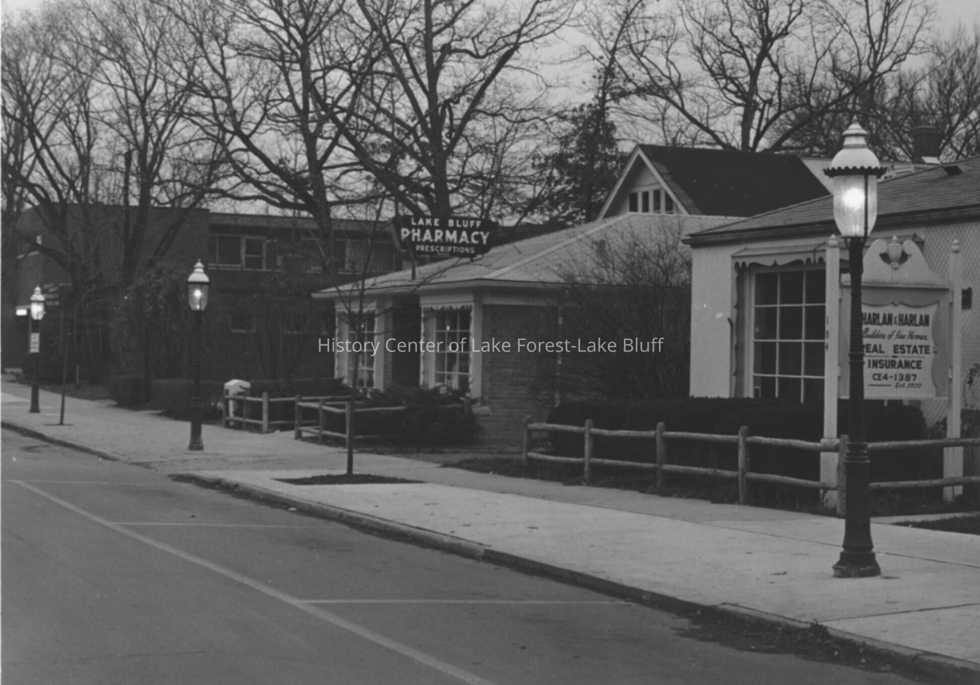 Lake Bluff Pharmacy (100 Scranton Avenue) and Harlan & Harlan Real Estate (104 Scranton Avenue). Street lights line the walk. Verso: November 21, 1965