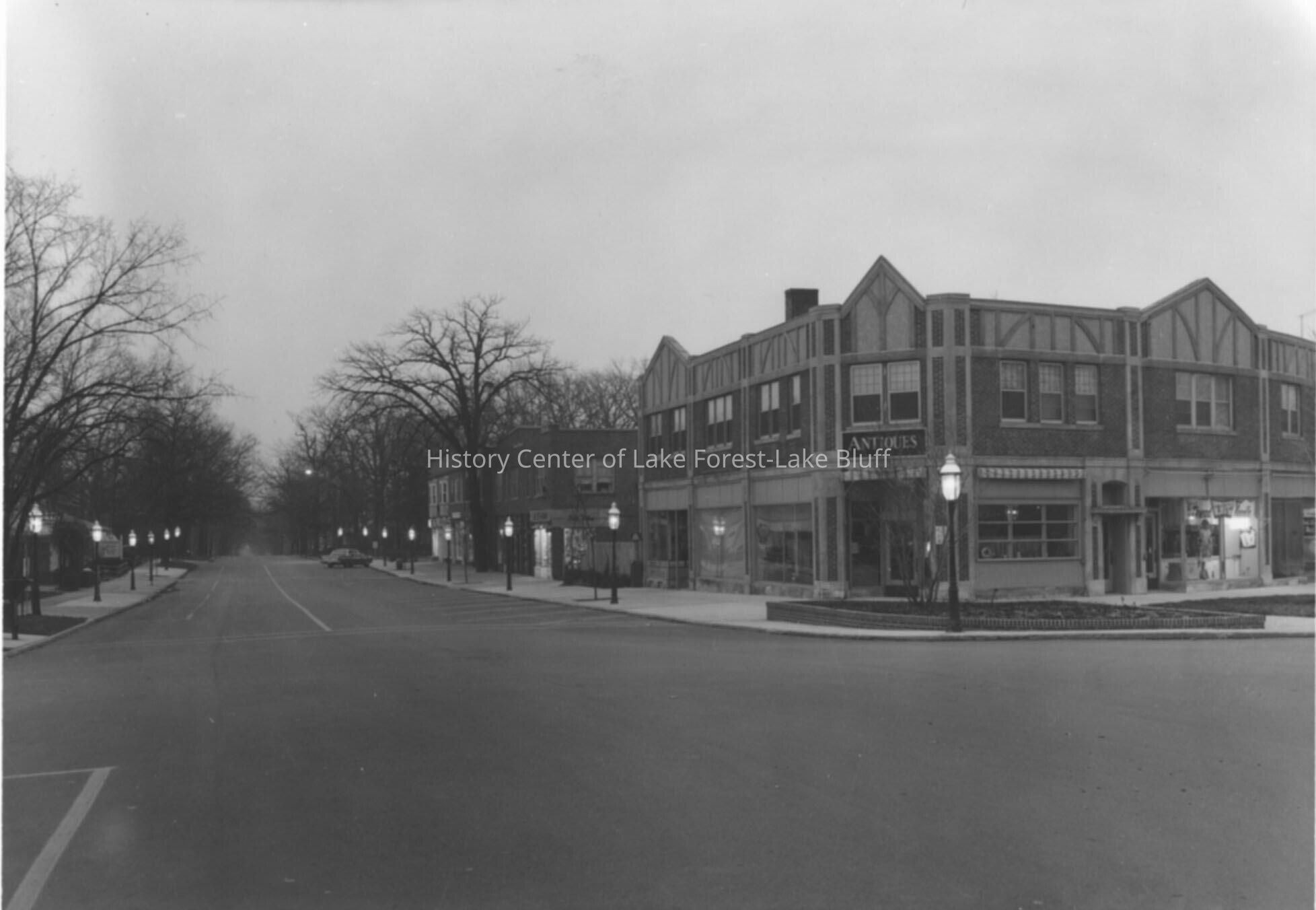 Lake Bluff Business District. No leaves on trees, street lights are lit. Shows the corner Antique Shop. Potts Antiques, 28 East Center Avenue. Date on back November 21, 1965. Looking east at corner of Scranton Avenue and Center Avenue.