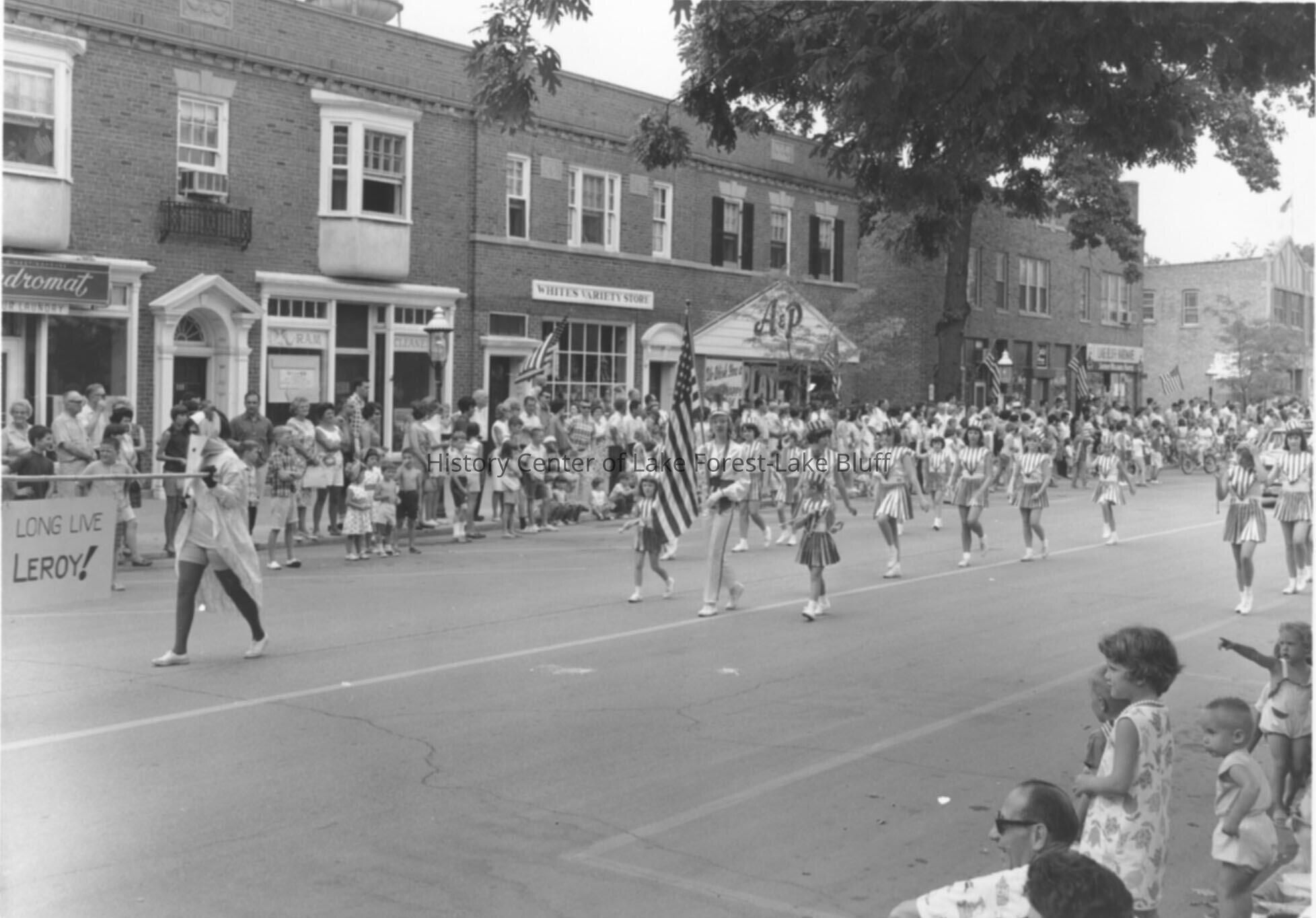 Lake Bluff Business District during Fourth of July parade. Young women in striped outfits marching. Lake Bluff Laundromat at 113 Scranton, White's Variety Store at 107 Scranton Avenue, the A&P. Verso: July 4, 1966 is stamped