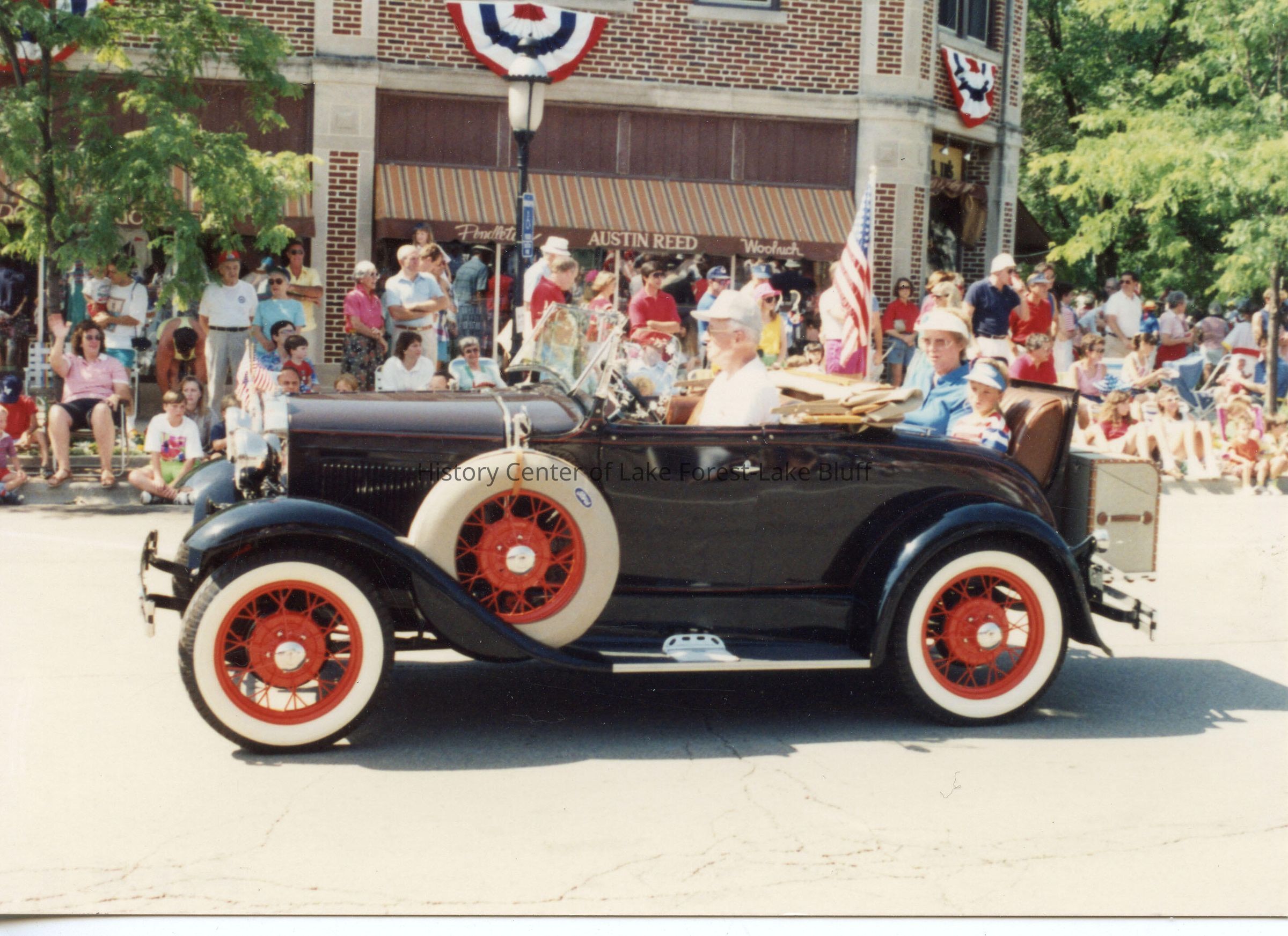 Lake Bluff Fourth of July Parade. Classic Ford car with jump seat. Osterlein's, 28 East Center Avenue, visible in the back ground. Undated. May be 1990-2000.