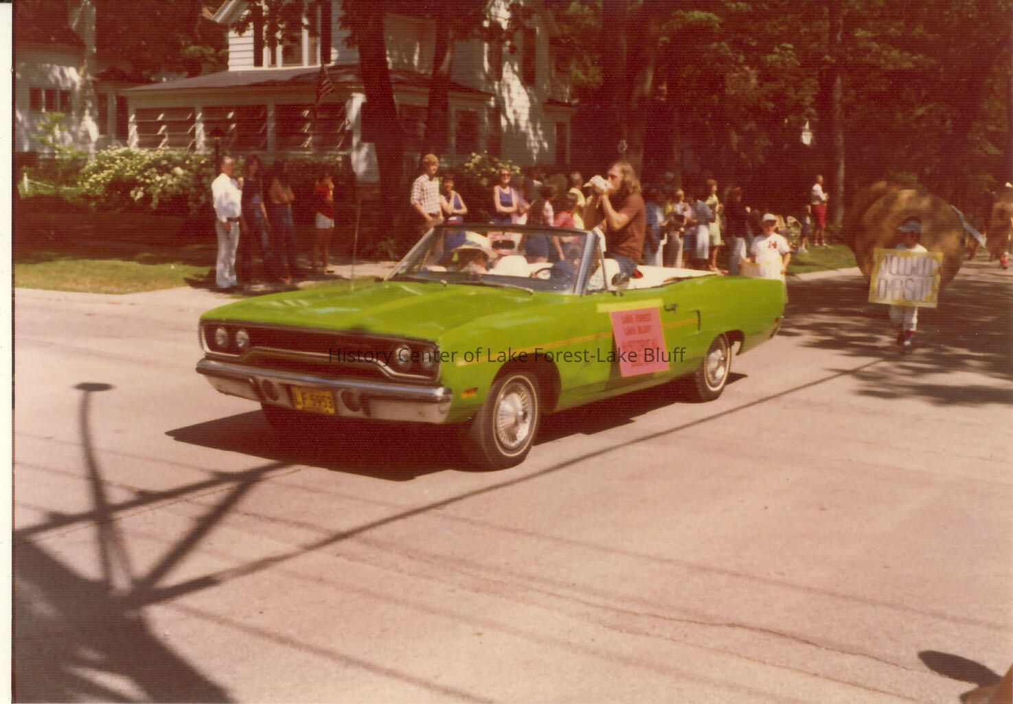 Green convertable with Lake Forest-Lake Bluff Historical Society unidentified representative in Lake Bluff 4th of July parade. Color.
