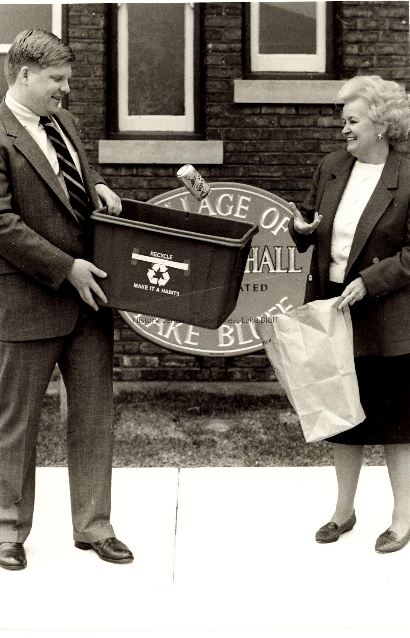 Black and white photograph of Pete Cummins, Deputy Village Admin., and Veva Schreiber; a Trustee, standing outside of the Lake Bluff Village Hall throwing a soda can into a recycling container, April 13, 1989.