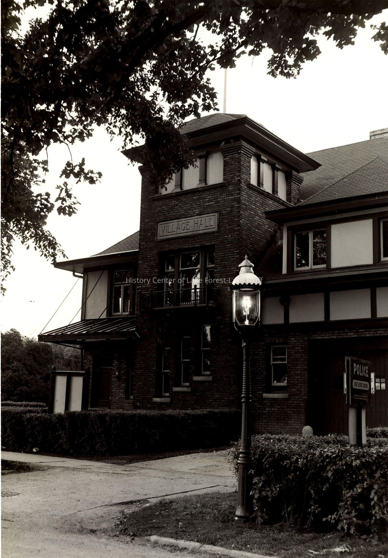 Black and white photograph of Lake Bluff Village Hall, July 8, 1965 (New Village gas lights). Police sign can also be seen.