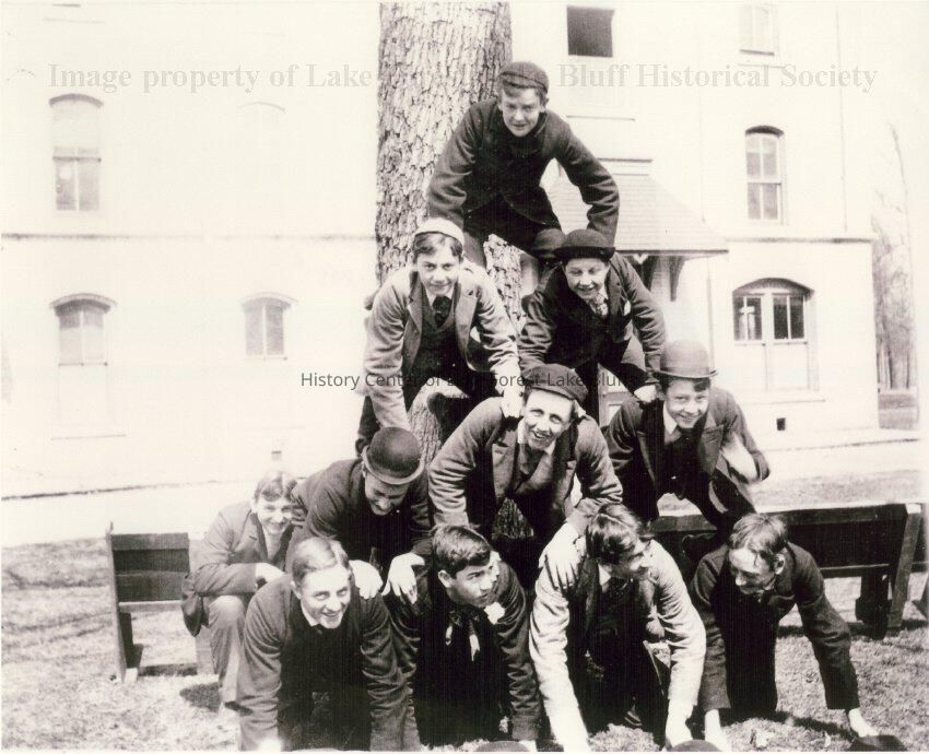 Unidentified group of young men in a four tier pyramid formation. Black and white image, circa 1895.