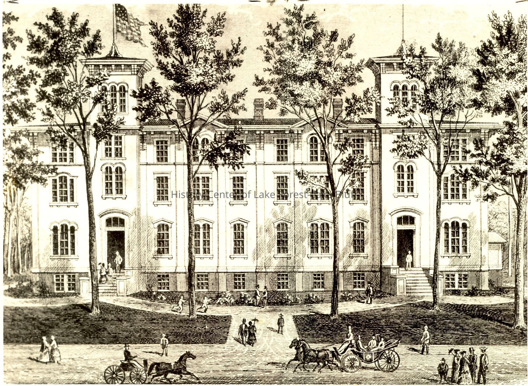 black and white image of drawing of original Lake Forest Academy building at SE corner of Sheridan and Deerpath. Built in 1859 - designed by Carter & Drake. Today the site of the Durand Art Institute. Was expanded from two to three stories in 1865.