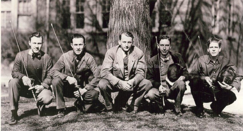Unidentified group of five young men. Two men on either side of center are holding fencing equipment. Fencing team. Black and white image.