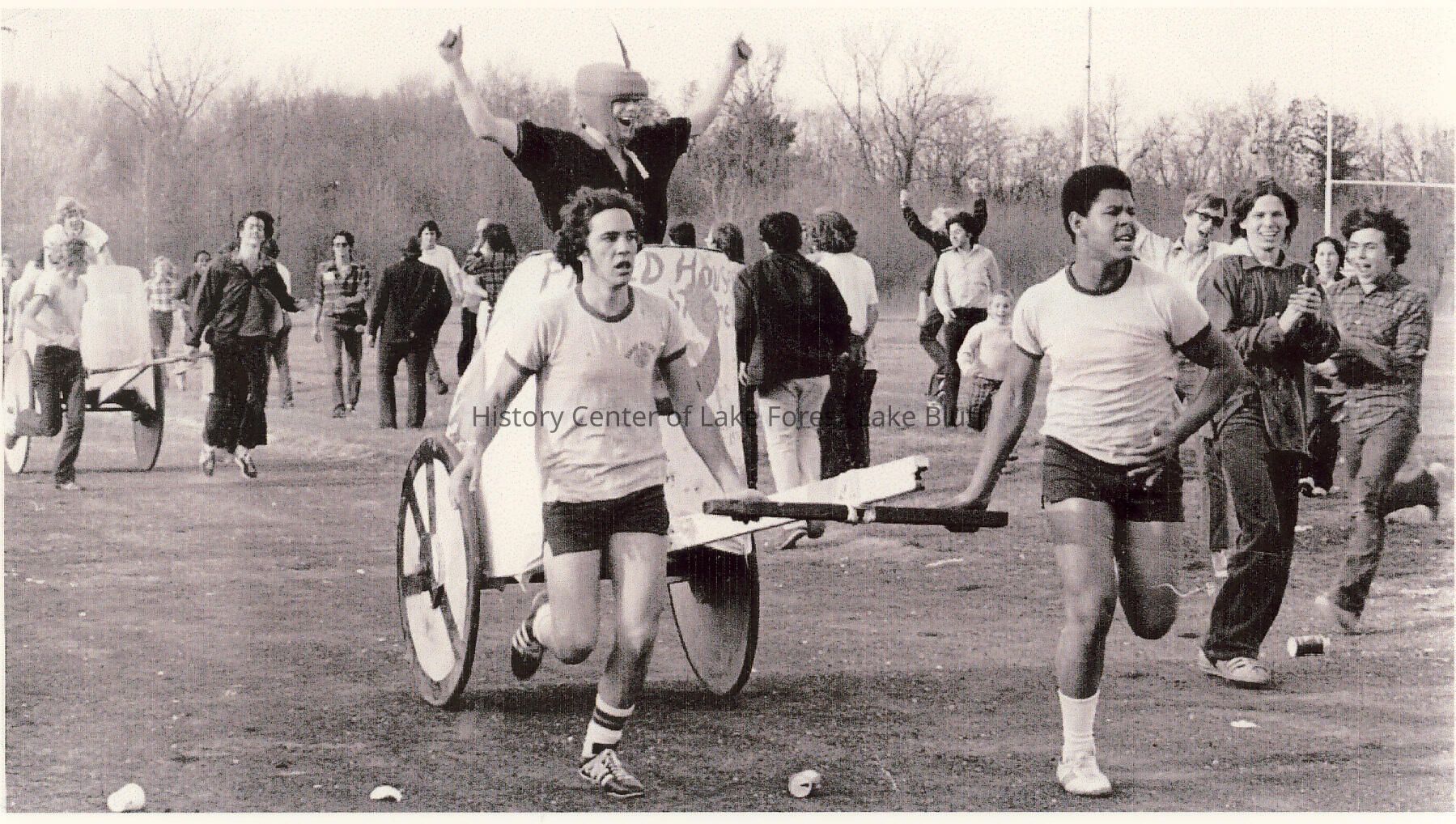 Group of young men at the1974 Lake Forest Academy Homecoming Class Chariot races. Steve Rogers is pulling the chariot on the right side of the photo - others in the foreground are unidentified. The chariot in the background has Chris Caldwell '75 on the right in dark clothes, and William Patterson '75 on top as a rider. On the left pull position is Burt Gaida '75 I believe. To the right in the far background walking to the action wearing a plaid shirt is Dean Alexandrou '75, while just to the right of the lead chariot on the field is Kevin Davidson '75.