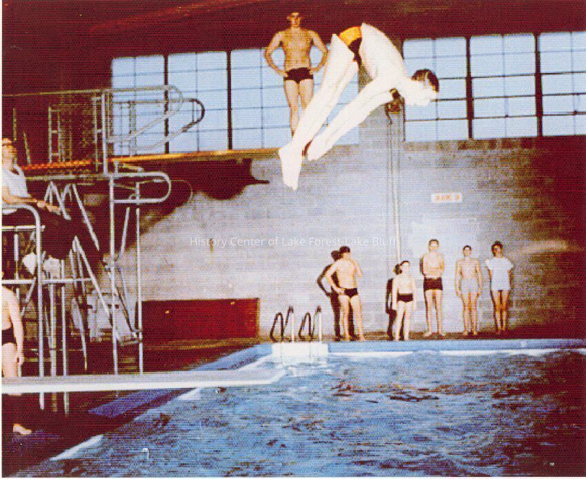 Diving competition. Color image, circa 1960 quality of photo is very pixelated Lake Forest Academy pool