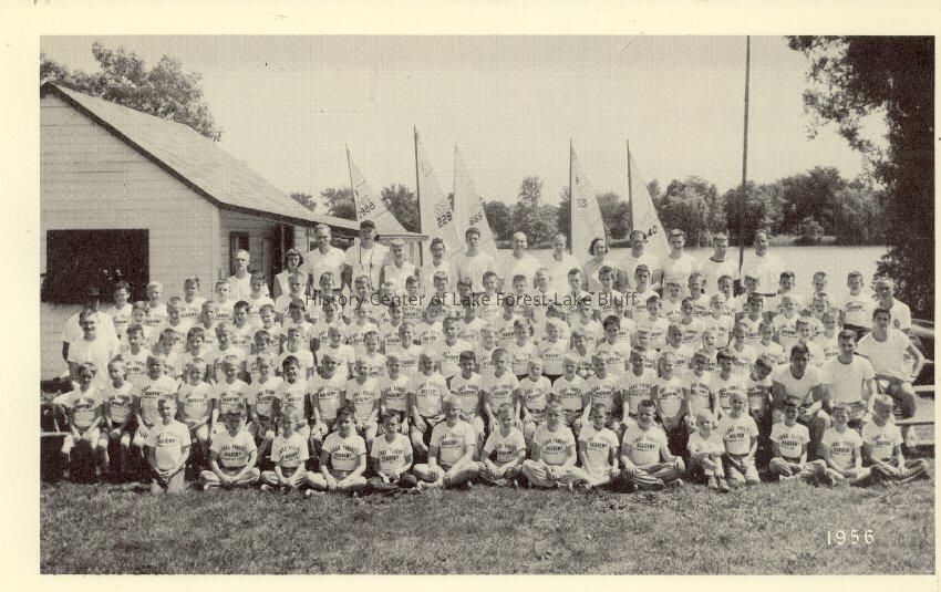 Lake Forest Academy summer day camp of 1956, group photo of all the camp kids and staff, next to the boat house, sail boats and lake.