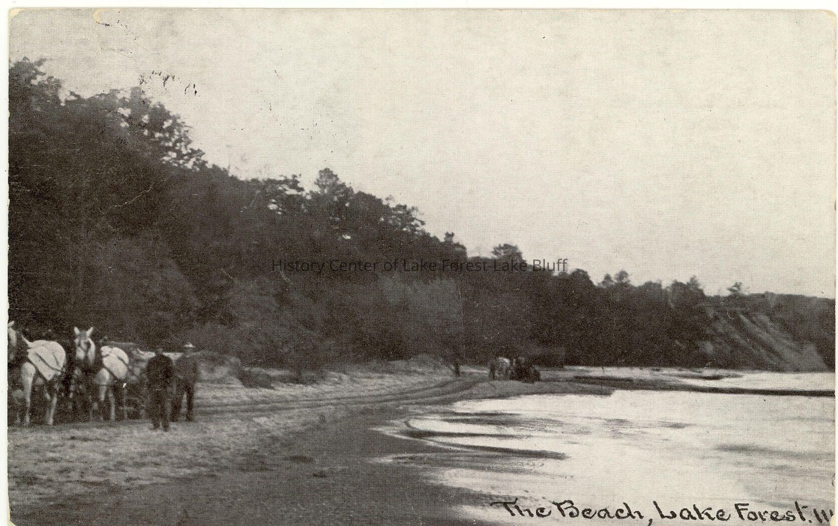 Postcard of horses, carts/buggies and men on the beach in Lake Forest. Writing on the back and postmarked Jan. 18, a 1 cent stamp.