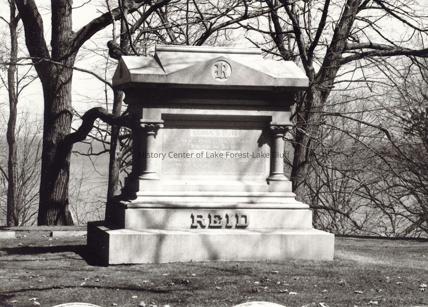 Gravestone in Lake Forest Cemetery. negatives included Simon S. Reid and Martha (Mary) McWilliams Reid see also 2004.62.9 and .10