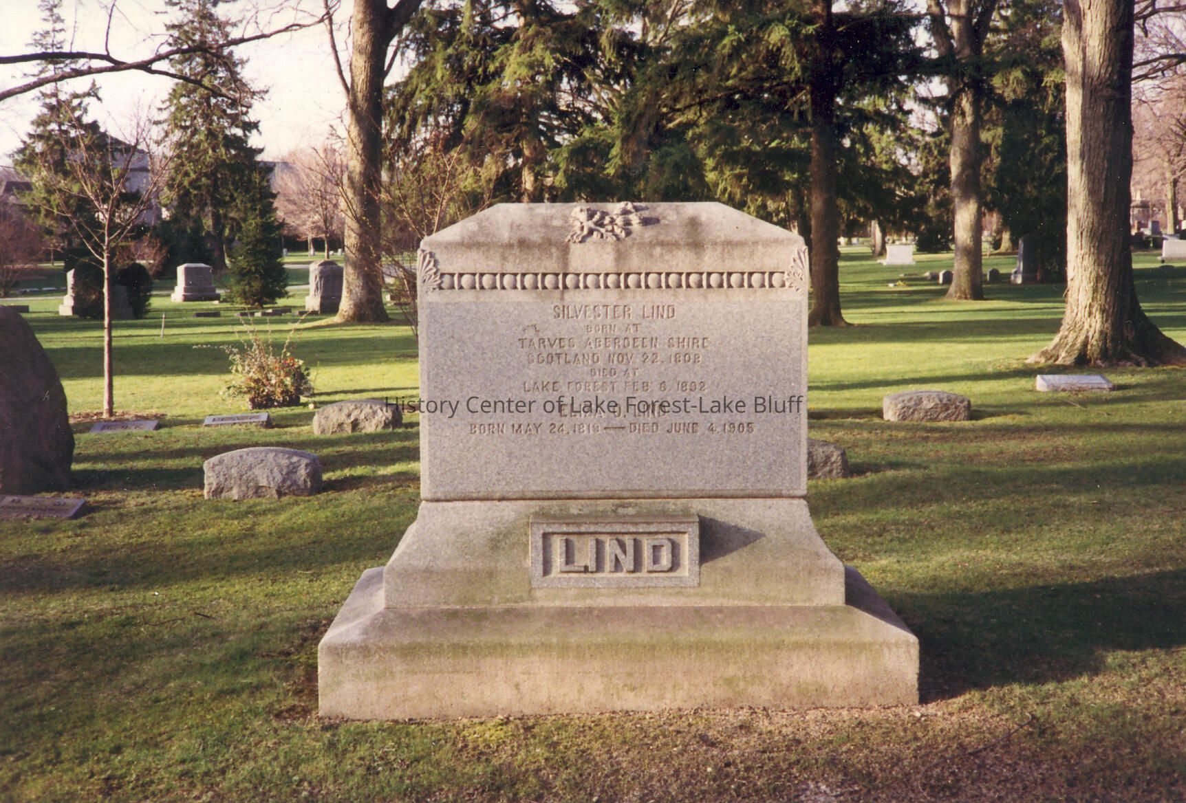 Silvester Lind born at Tarves Aberdeen Shire, Scotland, November 22, 1808, died at Lake Forest, Feb. 6, 1892