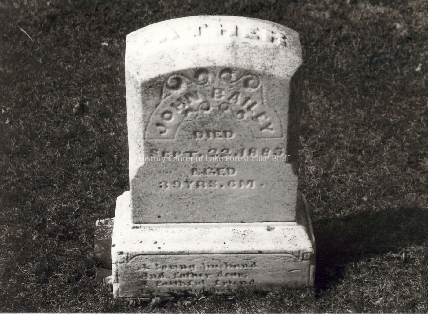 Gravestone in Lake Forest Cemetery. negatives also included John Bailey, died September 22, 1885 see also 2004.62.45