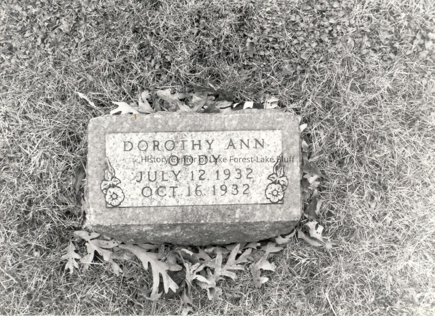 Gravestone in Lake Forest Cemetery. negatives included Dorothy Ann Oddy, July 12, 1932-October 16, 1932