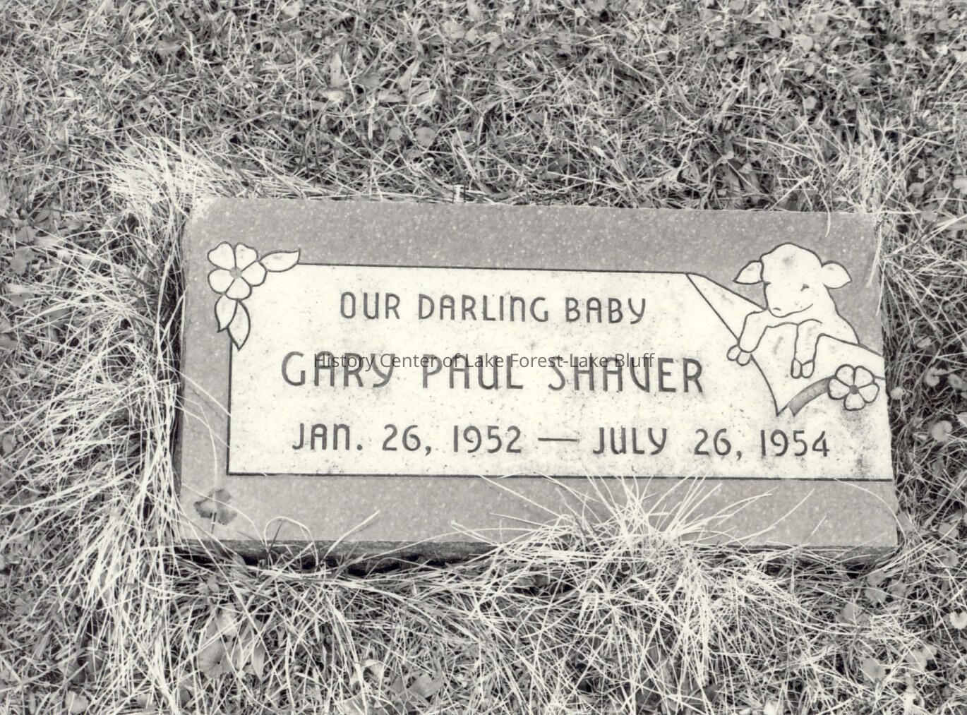 Gravestone in Lake Forest Cemetery. negatives included Our darling baby, Gary Paul Shaver, January 26, 1952-July 26, 1954