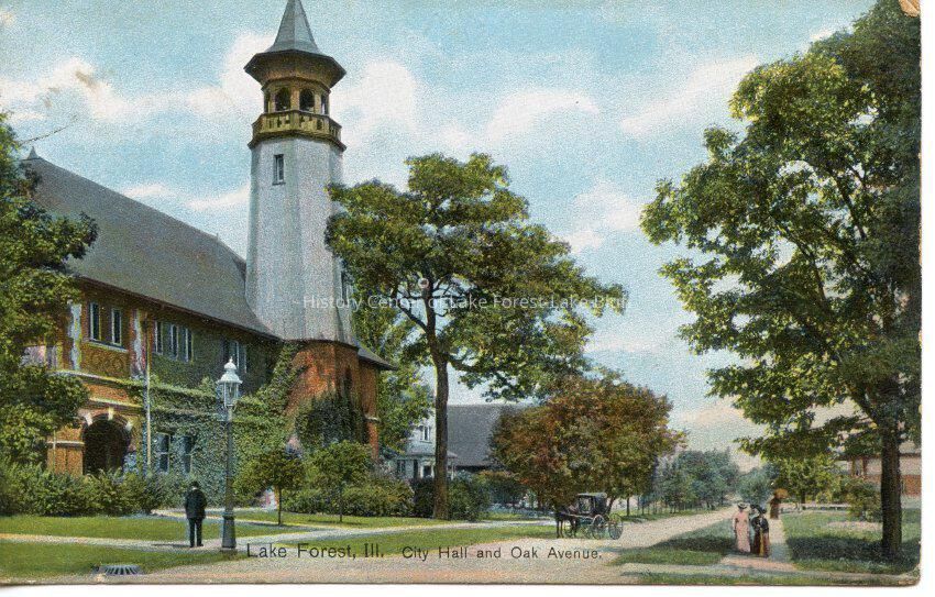 Color postcard of Lake Forest City Hall and Oak Avenue. Shows men and women strolling and horse and carriage. Addressed to Miss Elsa Gustafson, Chicago from Florence.
