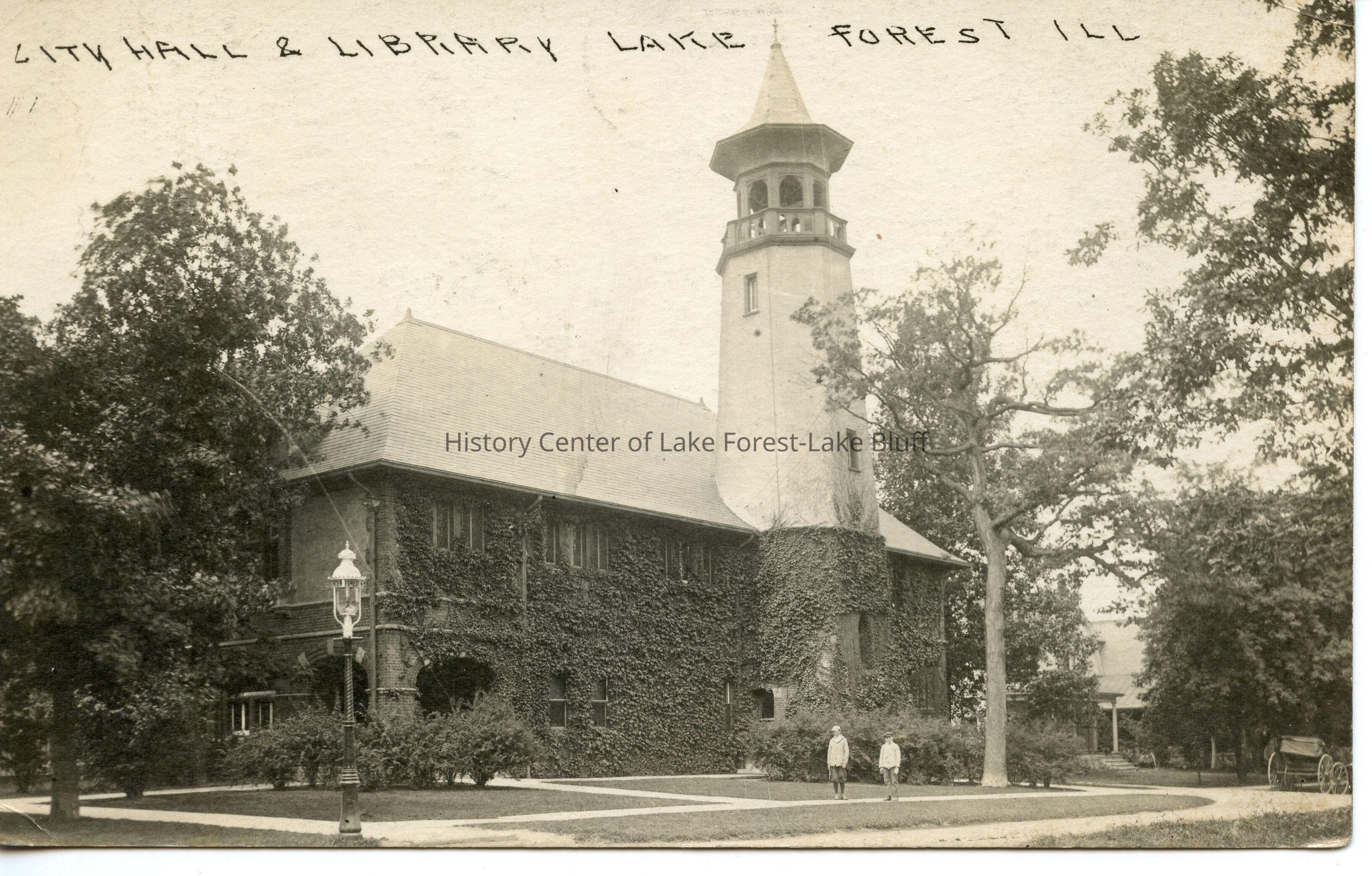 Black and white postcard of Lake Forest City Hall. Photo view by P. L. Huckins. Postmarked 1922. Addressed to Mrs. John Vickerman, Geneva, NY from Phyllis.Lexicon