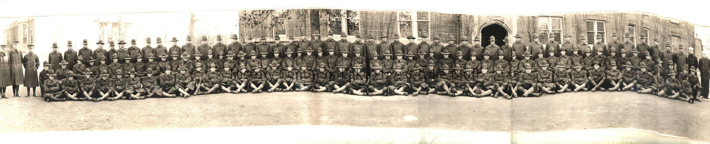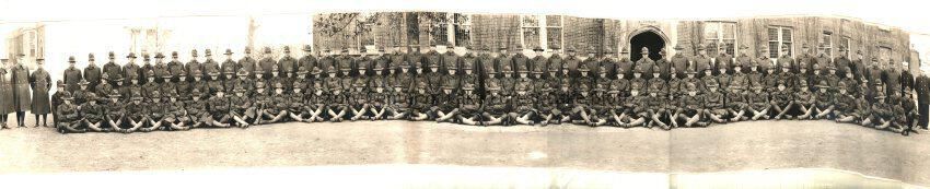 Long panoramic black and white photograph of Lake Forest College. Winter photograph of men dressed in military or riding attire standing and sitting in front of Blackstone and Harlan Halls. Possibily training for World War I?