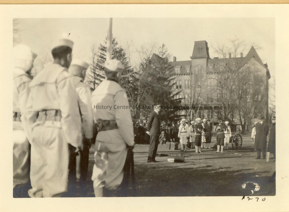 The dedication of the flag staff at Lake Forest College, it took place on April 27, 1916, a Thursday afternoon at 4 P.M. The day was selected because it was the birthday anniversary of General Grant. The staff was presented by Captain Israel Parsons Rumsey after he learned that the college never had one. Its location was set in the center of the open space in front of the library, firmly fixed in a deep cement base and crowned with a shining gilt ball. The flag raiser was Margaret Flagstaff Stroh, Grant Stroh's eldest daughter. Many citizens and students were present. Courtesy of Commander W.A. Moffett of the US Naval Training Station, The Marine Band and a detail of the Cadets of the Naval Station added much to the exercises. The college's senior class made the flag their class gift.Lexicon