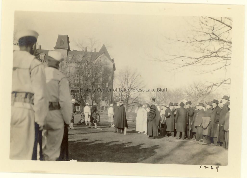 The dedication of the flag staff at Lake Forest College, it took place on April 27, 1916, a Thursday afternoon at 4 P.M. The day was selected because it was the birthday anniversary of General Grant. The staff was presented by Captain Israel Parsons Rumsey after he learned that the college never had one. Its location was set in the center of the open space in front of the library, firmly fixed in a deep cement base and crowned with a shining gilt ball. The flag raiser was Margaret Flagstaff Stroh, Grant Stroh's eldest daughter. Many citizens and students were present. Courtesy of Commander W.A. Moffett of the US Naval Training Station, The Marine Band and a detail of the Cadets of the Naval Station added much to the exercises. The college's senior class made the flag their class gift.Lexicon
