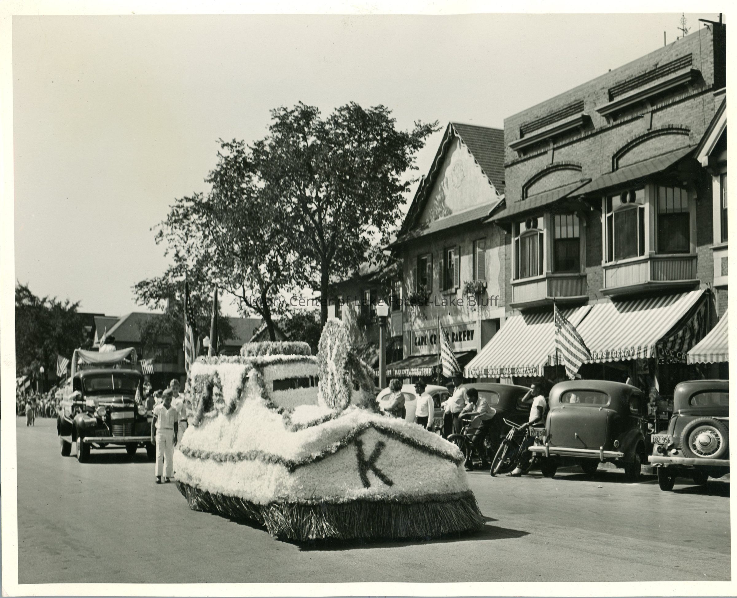 A vintage parade features a float adorned with flowers, passing through a bustling street lined with quaint shops.