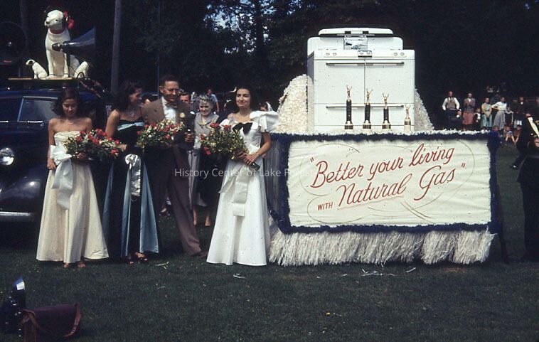 Kodachrome color slide. Parade floats: "Better your Living with Natural Gas" float with gas stove and oven on top. Several trophies on float. Lake Forest Day queens/princesses standing next to float. Car with RCA Victrola and dogs on top visible in back ground.