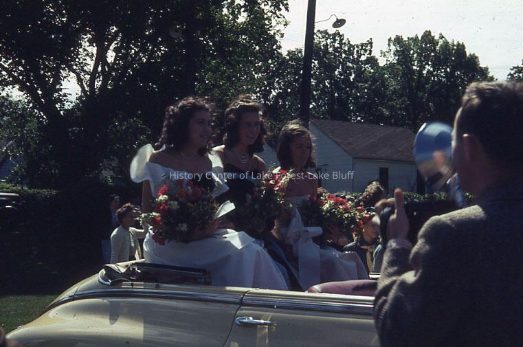Kodachrome color slides. Miss Lake Forest Day and attendants riding on the back of a convertible. Rose Ann Kerr, Celeste Rogondino, Mary Hesterman.