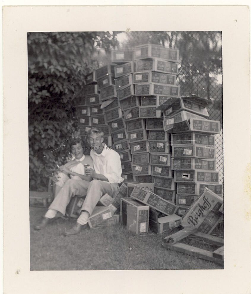 Black and white 2x2 photo of the Lake Forest Day in 1953 Kay Kerrigan Weston and John (Froggy) Fredriksen In front of empty beer boxes