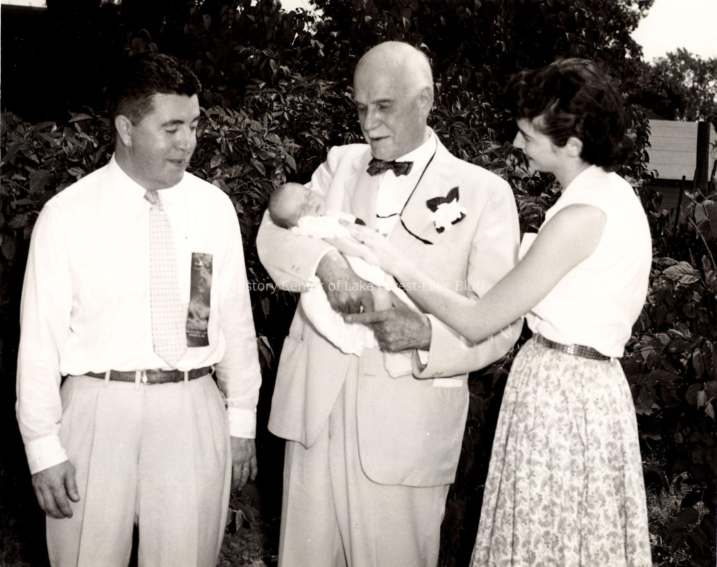 Black and white photograph of Dr. Proxmire holding an infant. Verso: "Jas Peddle" Lake Forest Day Parade honors Dr. Proxmire.