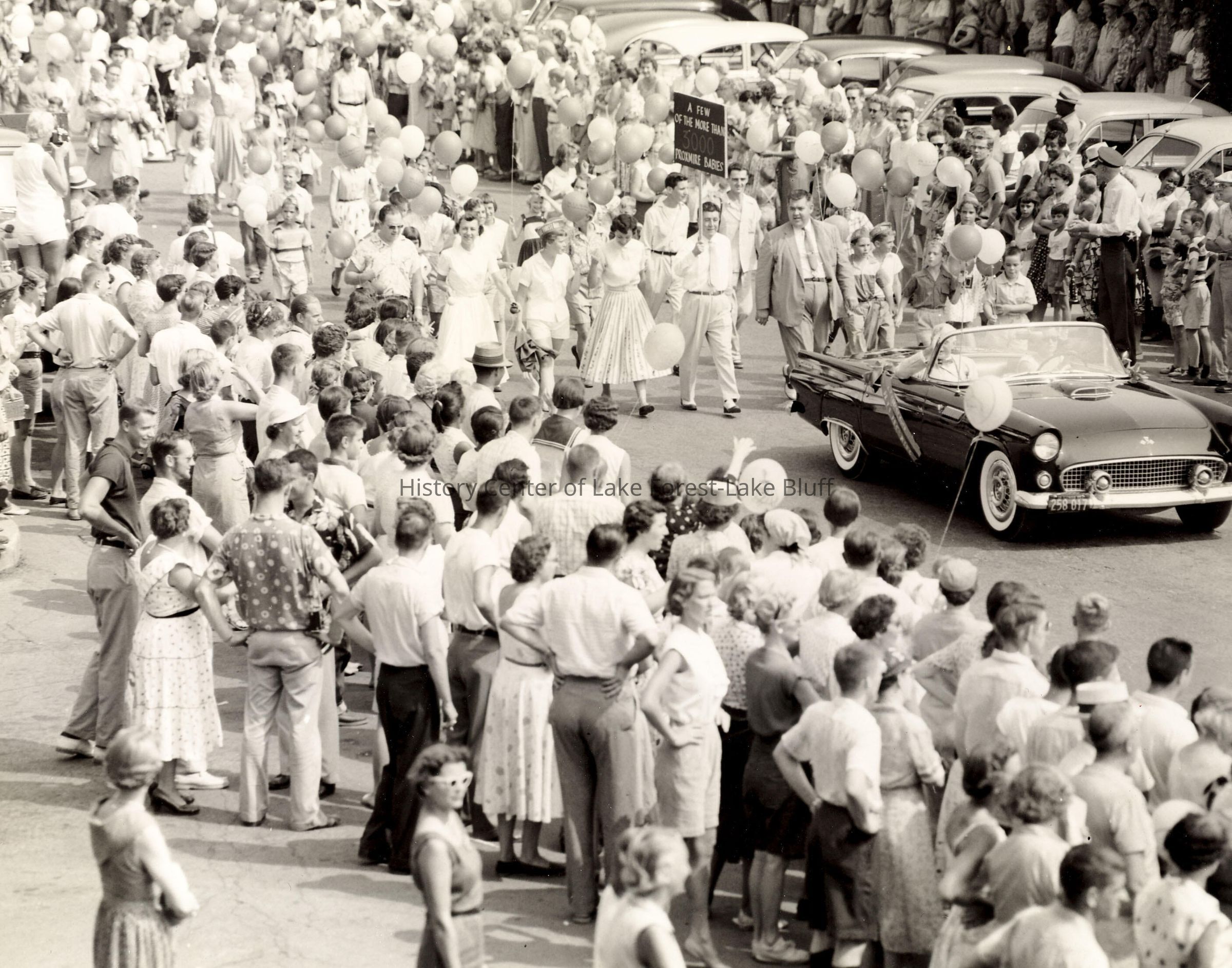 Lake Forest Day Parade honoring Dr. Proxmire "A Few of the more than 3,000 Proxmire Babies" march in parade. Grace McGill in car.