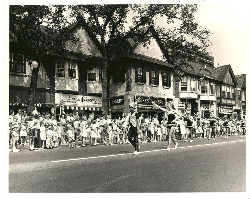 A drill team member as well as baton twirlers march along Western Avenue. The Lake Forest Bootery, Vivian Petersen, Kruse's Bakery, Bob Inn, and Forest House are all visible in the background.