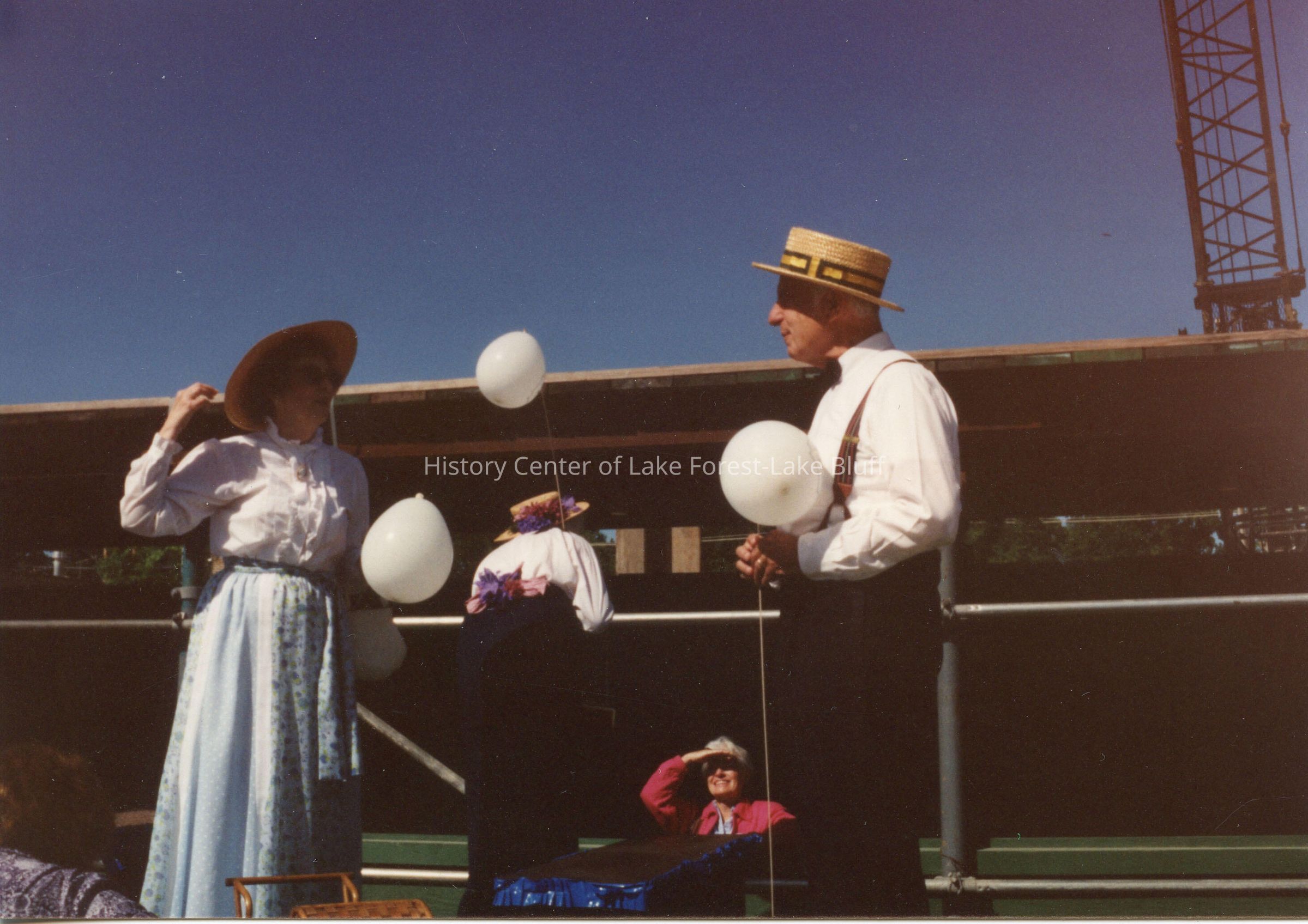 Man and woman in costume on Lake Forest-Lake Bluff Historical Society float in the Lake Forest Day parade.