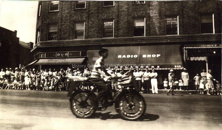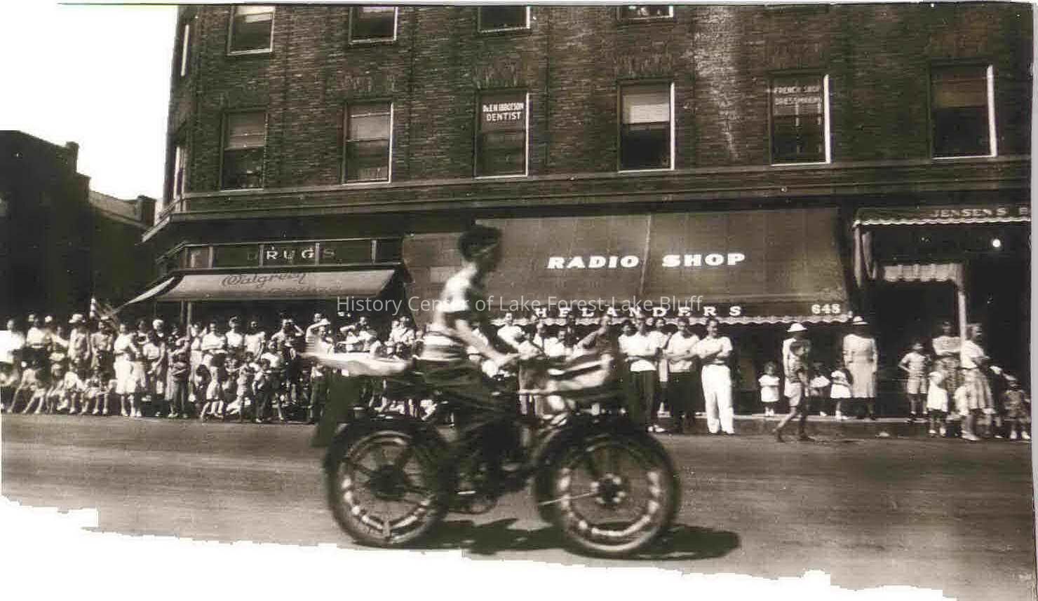 Don Kinney riding a bike in front of Walgreens on Western Avenue at the Lake Forest Day Parade.