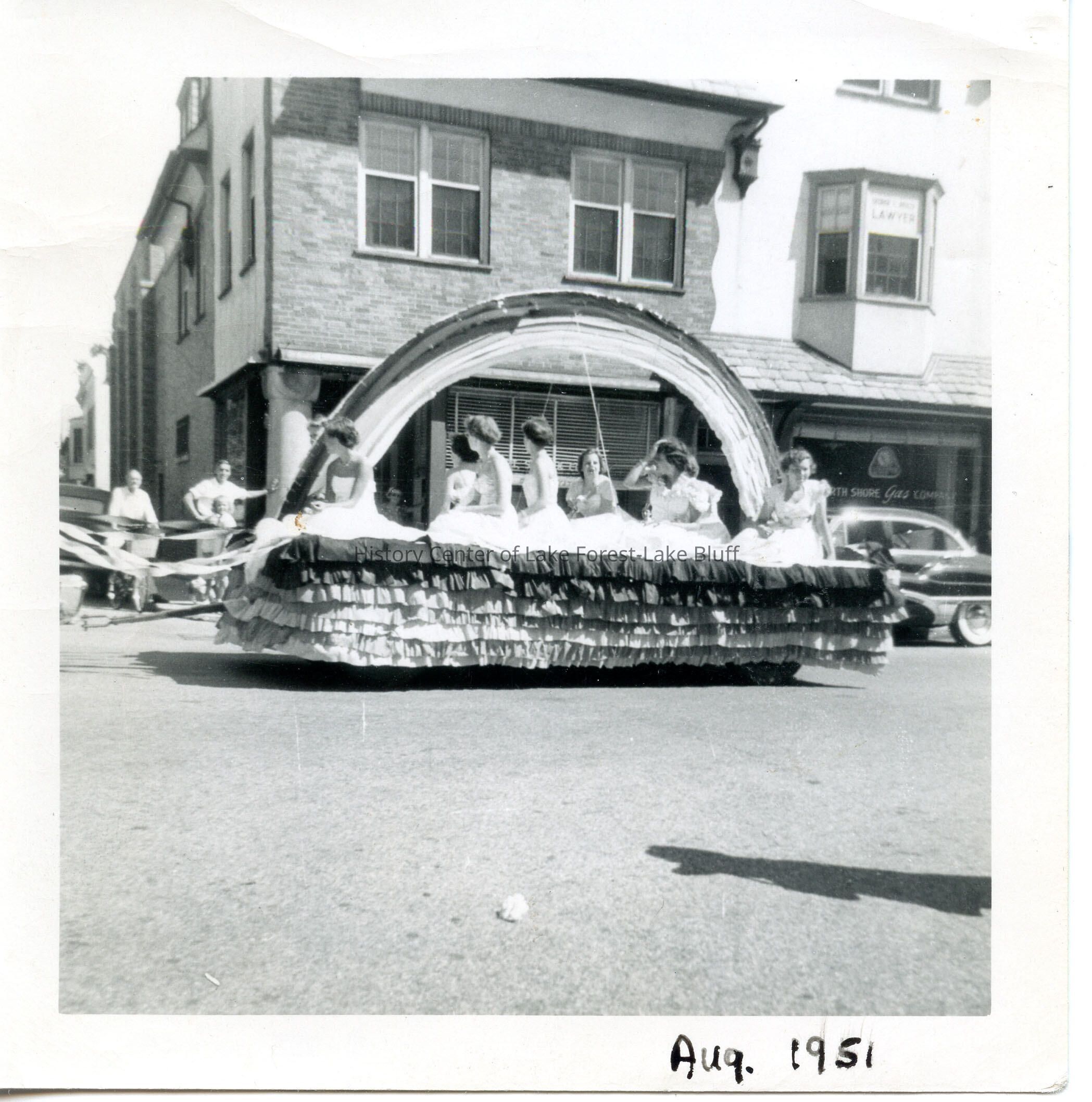 Float in Lake Forest Day Parade in August 1951. Caption reads: "First L. F. Day Float of Rainbow's." Float has a rainbow with several girls in white dresses - are they Rainbow Girls (daughters of Masons?) Float is on Deerpath, passing by North Shore Gas office.