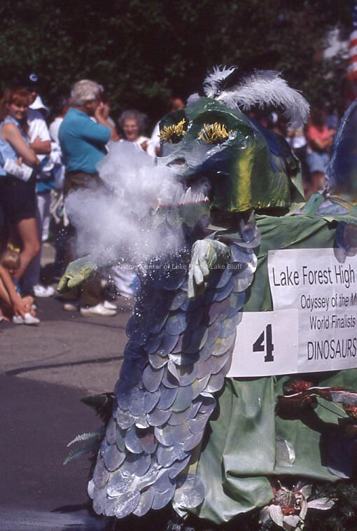 Lake Forest High School - A dragon with smoke billowing from its mouth goes along the parade route